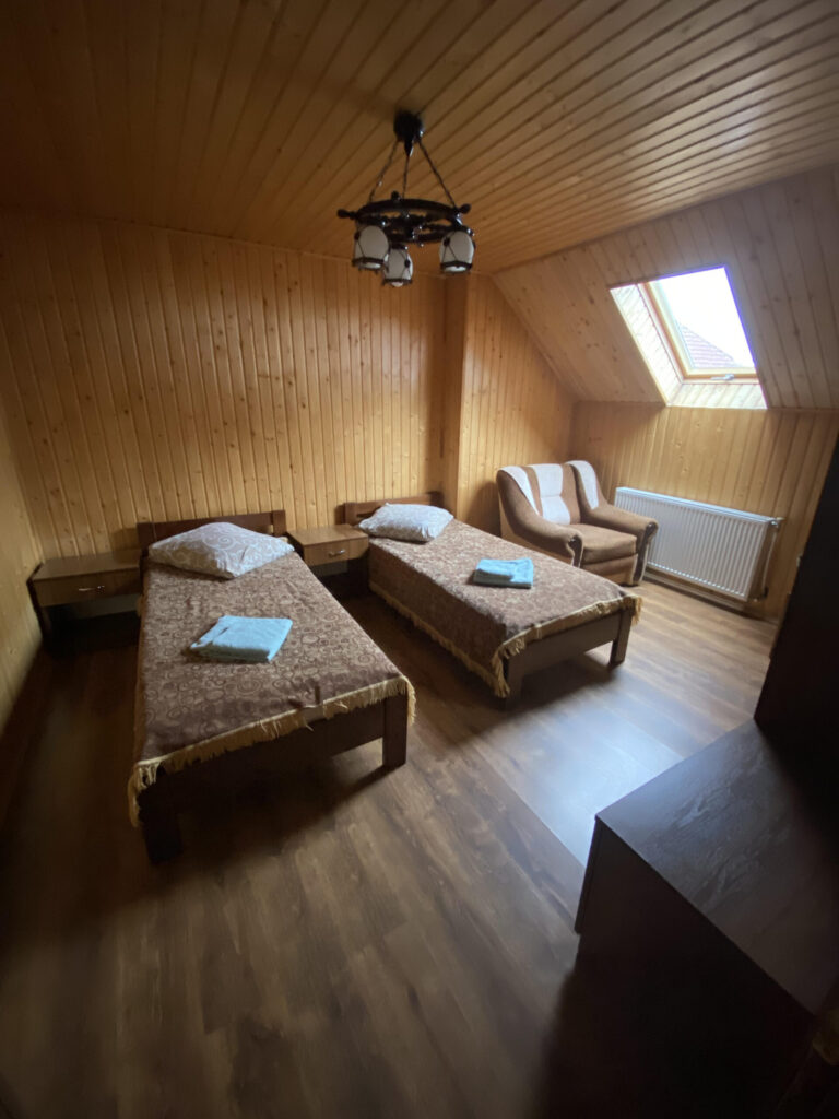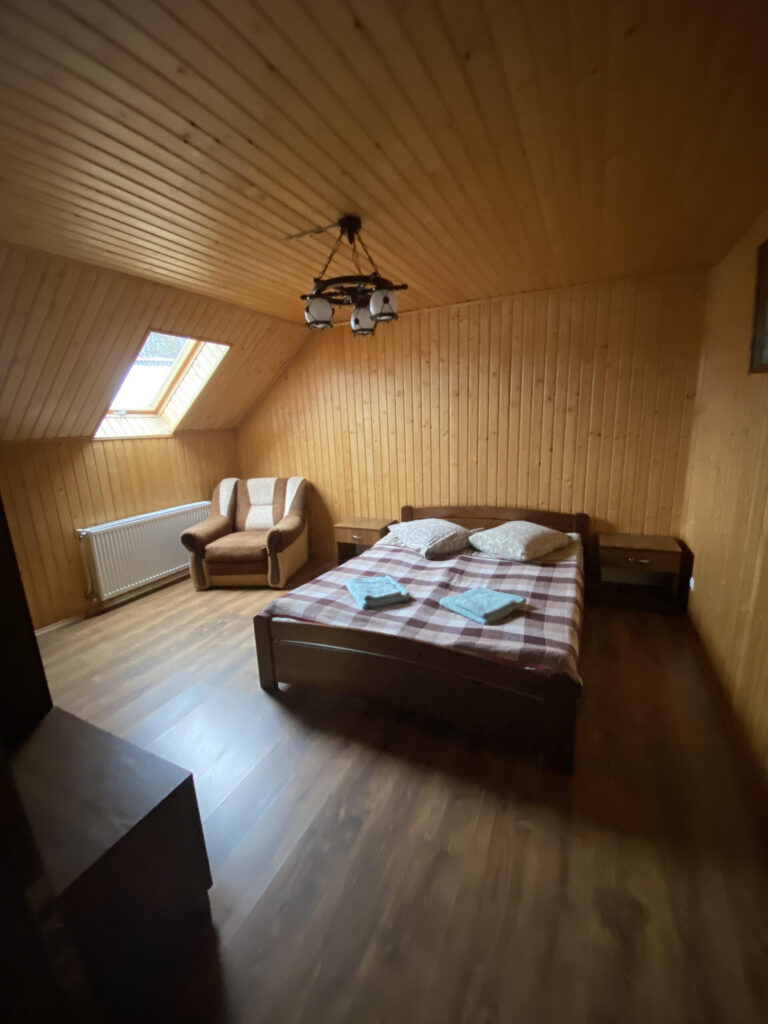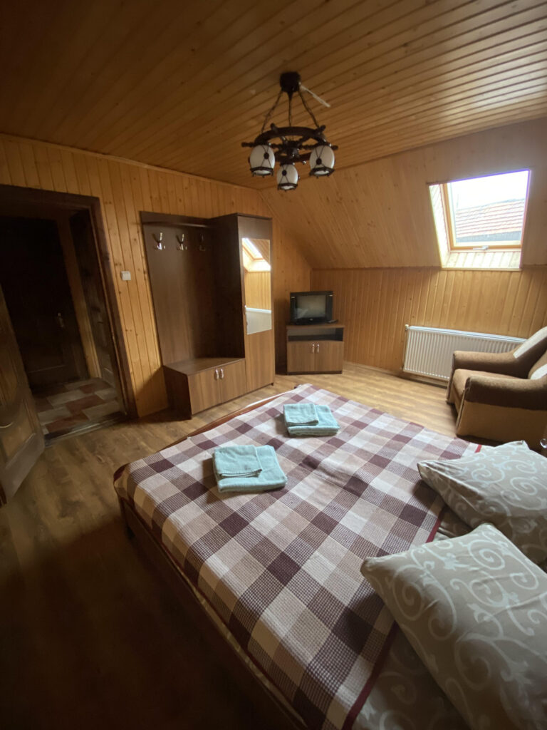 Шукаєте просторий номер для великої сім’ї чи компанії? Пропонуємо сімейний номер. Окремий вхід, дві кімнати, в одній кімнаті двоспальне ліжко, в другій кімнаті два односпальні ліжка, шафа для одягу та простора ванна кімната! Номер обладнаний всім необхідним, аби проживання було справді комфортним.